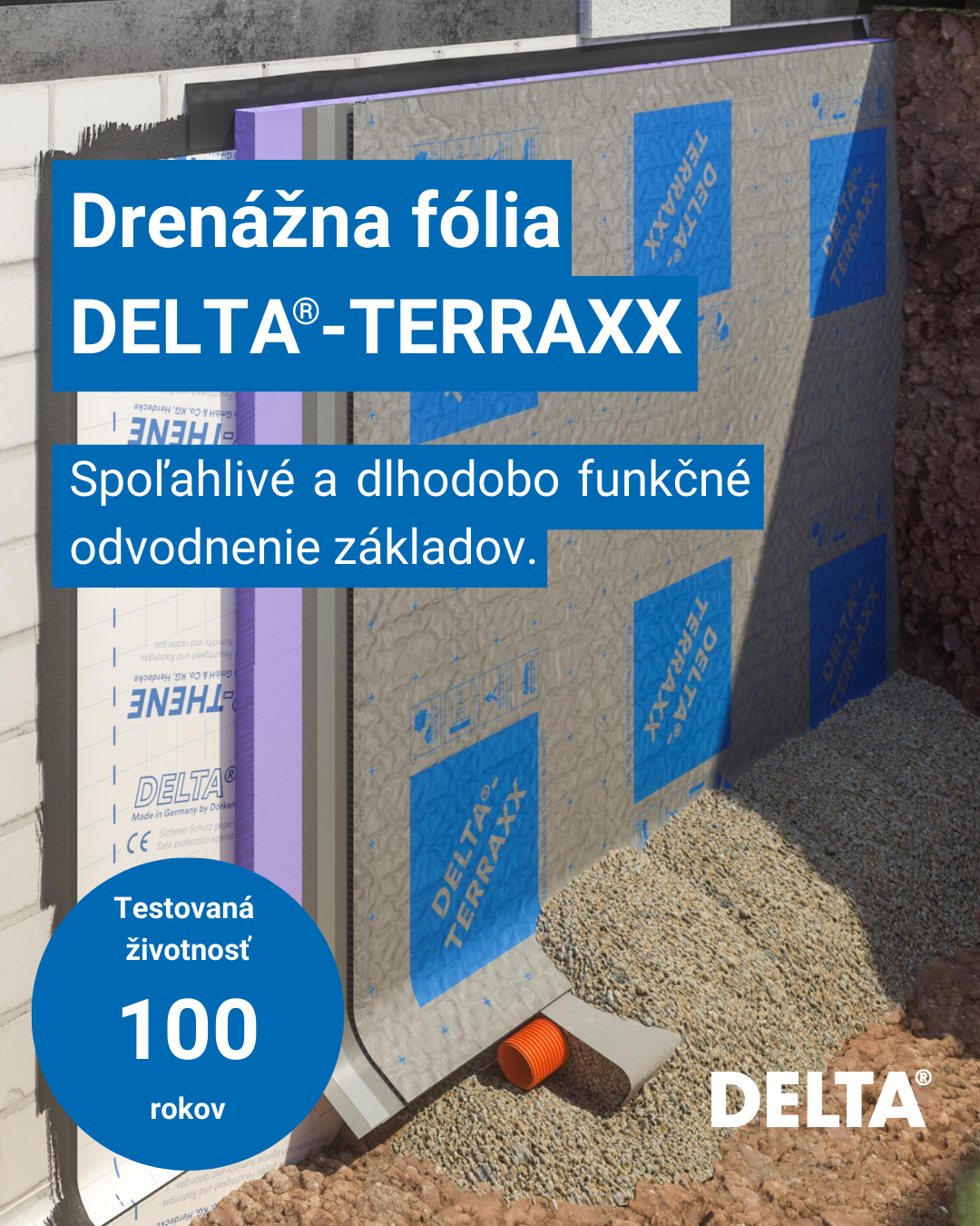 Účinná plošná drenáž bez nutnosti výmeny obsypu, ktorá značne znižuje náklady na odvodnenie stavby. Disponuje vysokou pevnosťou v tlaku a preto je možné fóliu zabudovať až do hĺbky 10 m. Integrovaná lepiaca páska na okraji zjednodušuje pokládku a zabraňuje vniknutiu zeminy do štruktúry nopov a drenážneho potrubia. DELTA®-TERRAXX pozostáva zo 100% čistého materiálu bez regenerátov a tým oproti lacným nopovým fóliám zaručuje životnosť až 100 rokov!