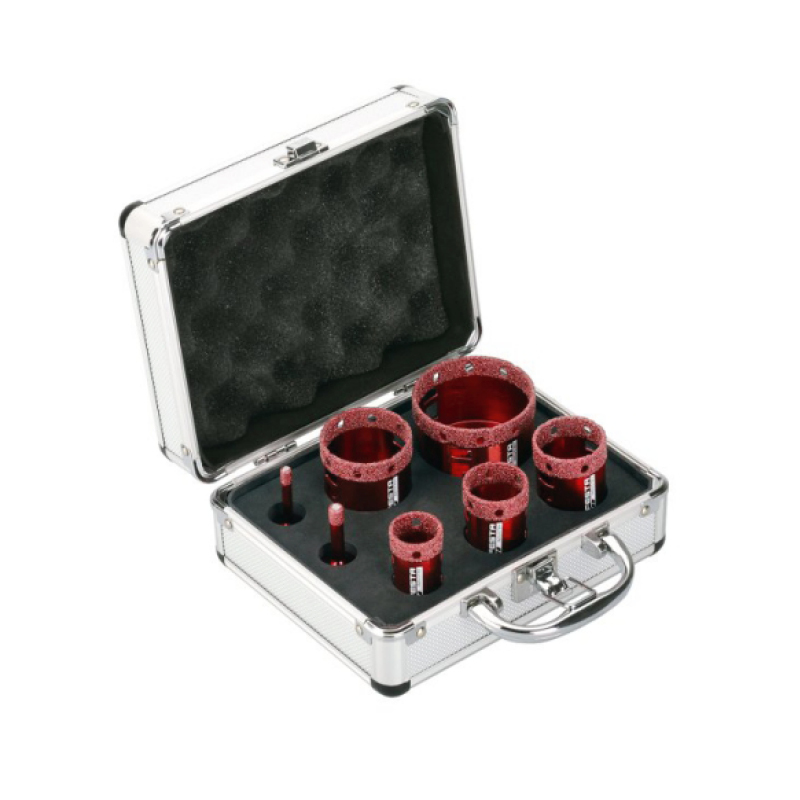 Priemery koruniek v sade – 6, 8, 25, 35, 40, 50, 68 mm. Pre „suché aj mokré“ vŕtanie. Presné a rýchle vŕtanie / vykružovanie do kameňa, tvrdých dlažieb, gresu, obkladov, žuly, mramoru a iných extrémne tvrdých materiálov. Výška vrstvy diamantu 10 mm.